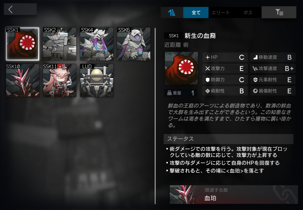 鮮血の王庭のアーツによる創造物。近距離術攻撃をしてくる。対巫術軌道式爆弾を攻撃する時のみ、遠距離攻撃可能。この時は物理ダメージを与える。攻撃対象がブロックしている敵数の分、通常攻撃の倍率が上昇する(100%+敵数×20%)。通常攻撃後、与えたダメージの220%分のHPを回復する。死亡時、その場に血珀を1体召喚する。5体ほど襲いかかってくる。
