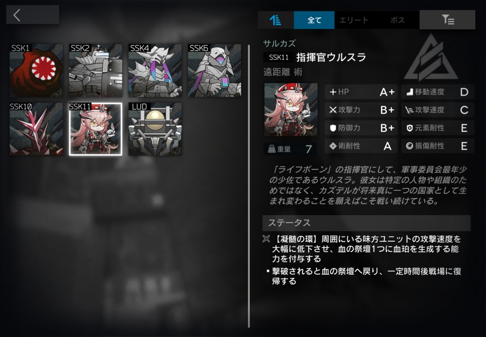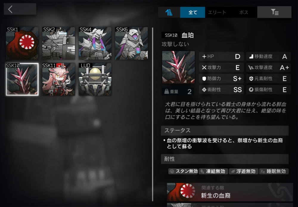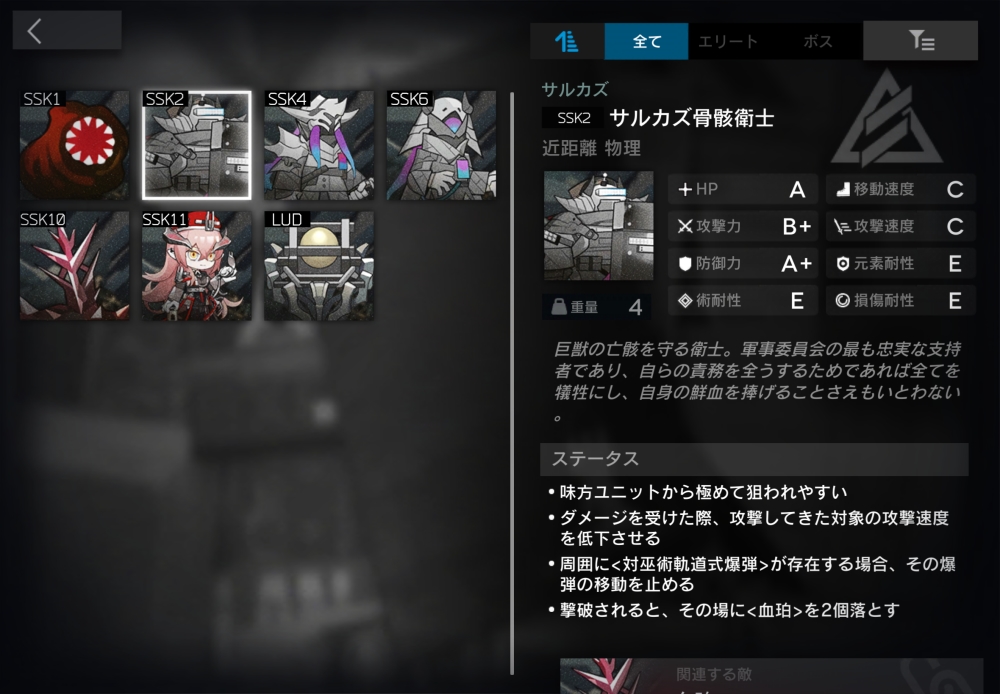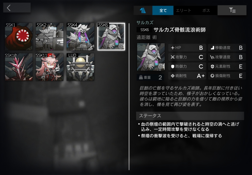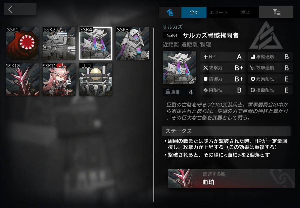 巨獣の亡骸を守るサルカズ術師。血の祭壇の効果範囲内で倒された時、2秒かけてHPを100%回復し、漂流状態になる。漂流状態は、無敵。移動・攻撃せず、ブロック不可。