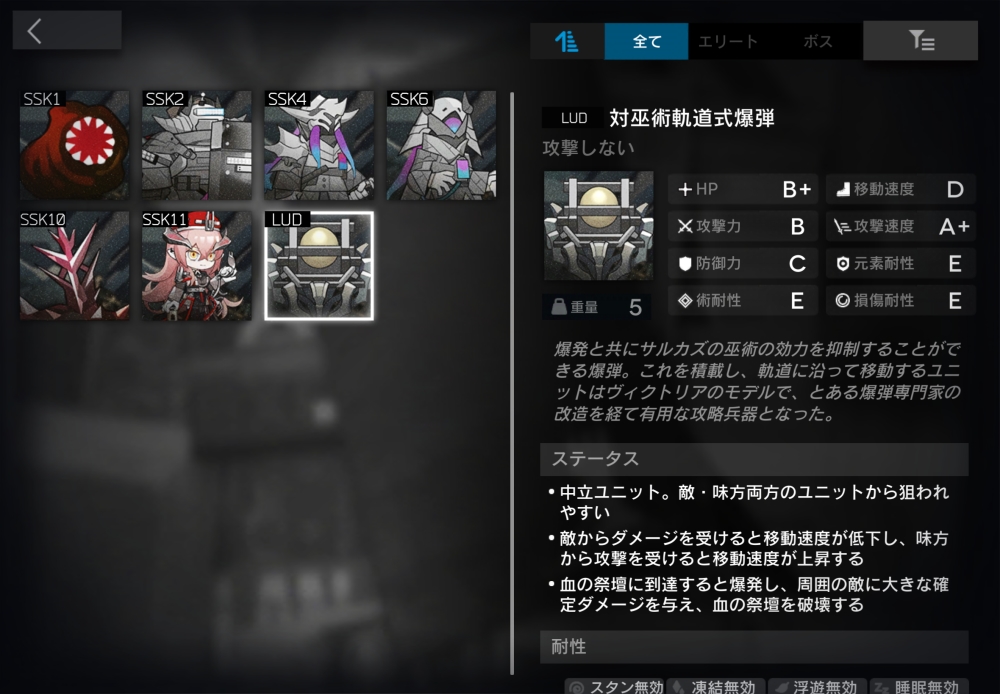 爆発と共にサルカズの巫術の効力を抑制することができる爆弾。敵味方両方から狙われやすいが味方からのダメージは無効化する。SP0の時は移動しない。味方から攻撃された時、SP+1。敵から攻撃された時、SP-1。血の祭壇・血誓の王座の半径1.0以内に入るか、Duq’arael・「君主の紅」(第二形態)の半径0.5以内に入ると発動。攻撃範囲内の敵全員に攻撃力1000%(5000)の確定ダメージを与え、血の祭壇・血誓の王座を破壊する。その後、自身は消滅する。