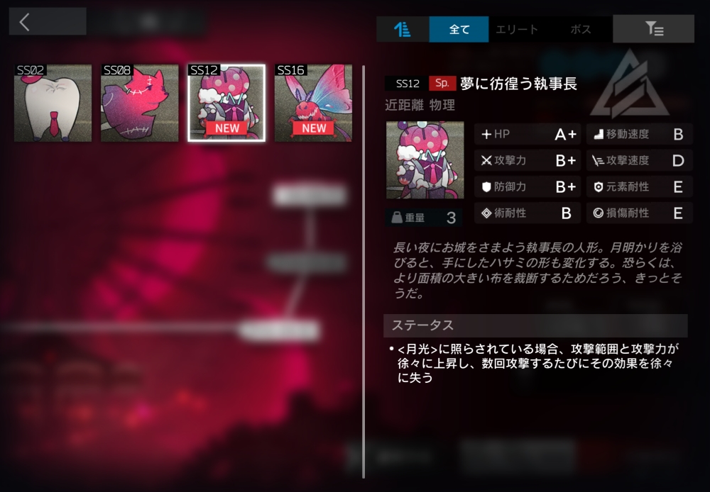 長い夜にお城をさまよう執事長の人形。月光に照らされている間、3秒ごとに攻撃力+5%・攻撃半径+0.05(30回まで累積)。このバフは、3回攻撃するごとに1回消費される。また、月光に照らされていると遠距離攻撃になる。今回初登場。