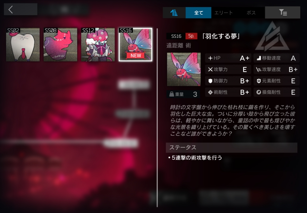 時計の文字盤から伸びた枯れ枝に繭を作り、そこから羽化した巨大な虫。遠距離術攻撃をしてくる。通常攻撃は5回攻撃。HPと防御力が高い。今回初登場。
