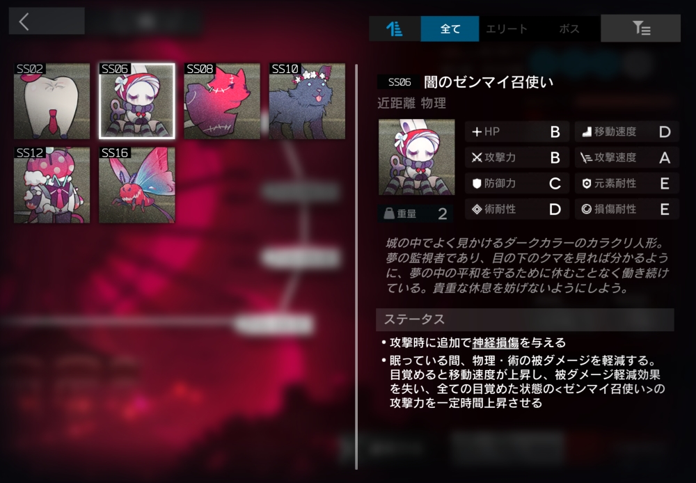 夢に現れる奥歯のような創造物。空挺兵のようにどこからともなく現れる。出現時は休眠状態。【覚醒】(必要SP50)覚醒状態に移行し、移動速度+1.3。攻撃時、攻撃力20%(78)の神経損傷を追加で与えてくる。移行から30秒後、休眠状態に戻る。4体ほど襲いかかってくる。