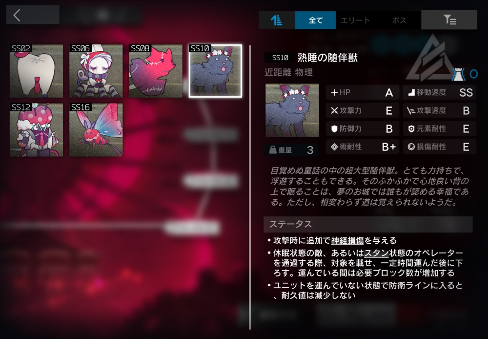 目覚めぬ童話の中の超大型随伴獣。攻撃時、攻撃力150%(248)の神経損傷を追加で与えてくる。単体の時は耐久値が減らないが、条件を満たした半径0.25以内のユニットを、乗客として搭乗させ(1体まで)、輸送状態に移行した場合は耐久値減少量+1。また、自身の必要ブロック数が、乗客のブロック数だけ増加する。5体ほど襲いかかってくる。