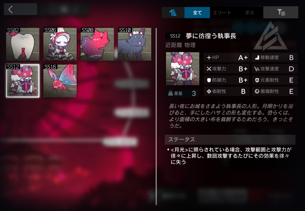 長い夜にお城をさまよう執事長の人形。月光に照らされている間、3秒ごとに攻撃力+5%・攻撃半径+0.05(30回まで累積)。このバフは、3回攻撃するごとに1回消費される。また、月光に照らされていると遠距離攻撃になる。3体ほど襲いかかってくる。
