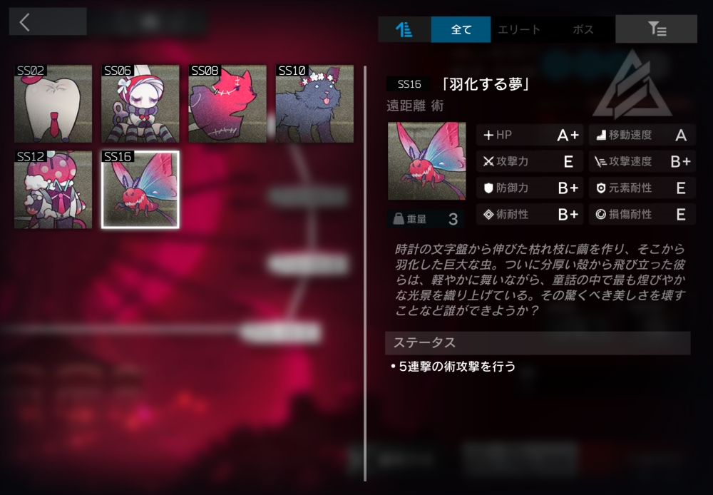 時計の文字盤から伸びた枯れ枝に繭を作り、そこから羽化した巨大な虫。遠距離術攻撃をしてくる。通常攻撃は5回攻撃。HPと防御力が高い。