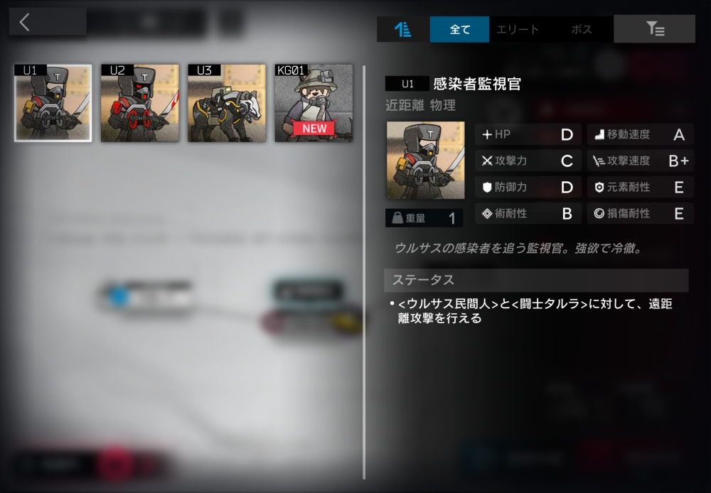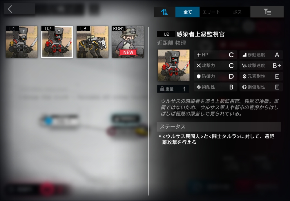 ウルサスの感染者許さないマンの偉い人。ウルサス民間人に対して遠距離攻撃してくる。3体ほど襲いかかってくる。