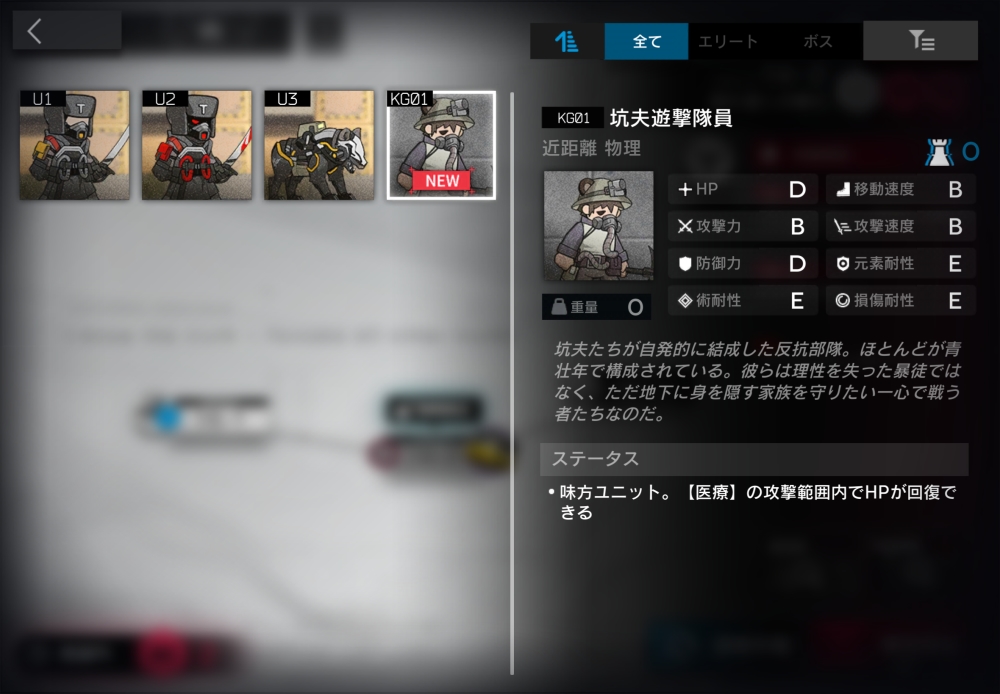 坑夫たちが自発的に結成した反抗部隊。中立ユニット。味方の対象にならず、敵から攻撃される。0.3秒ごとに、自身と周囲8マスの高リスク汚染を3秒間無効にする。医療オペレーターの攻撃範囲内にいる時、そのオペレーターの攻撃力の50%分のHPを毎秒回復する。医療が複数いる場合は個別に計算される。今回初登場。