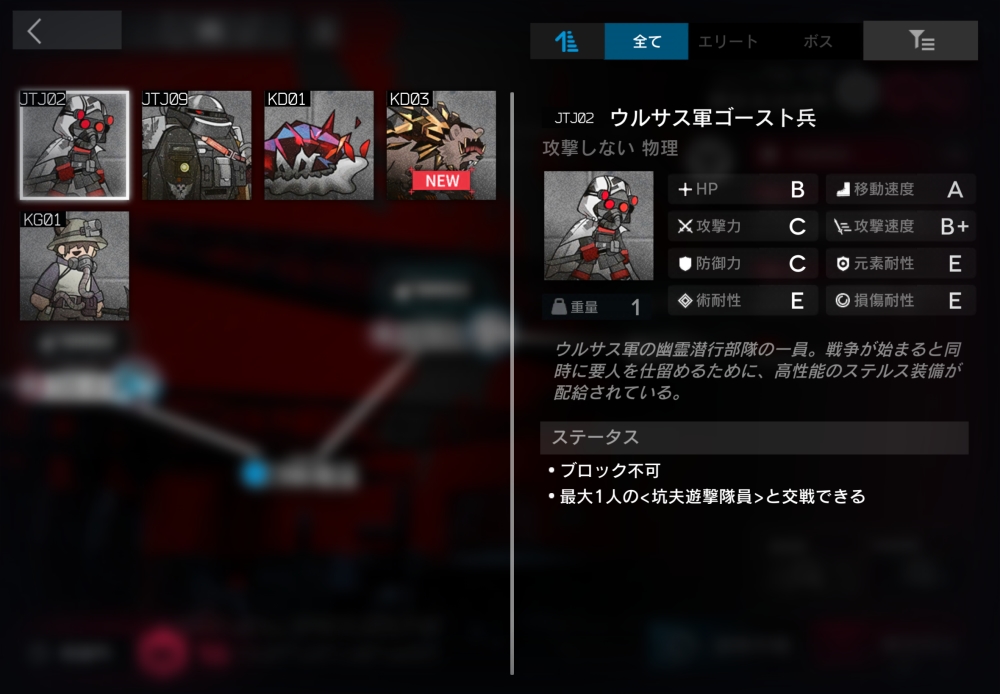 ウルサス軍の幽霊潜行部隊の一員。一部の中立ユニットにのみ通常攻撃できる。ブロック不可。半径0.9以内に坑夫遊撃隊員が入ると、自身とその坑夫をバインドして交戦状態に入る。今回初登場。