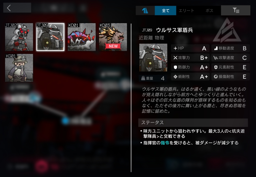 ウルサス軍の盾兵。ブロックされていない時、一部の中立ユニットにのみ遠距離攻撃できる。半径0.9以内に坑夫遊撃隊員が入ると、自身とその坑夫をバインドして交戦状態に入る。マップ上にウルサス軍前線指揮兵系がいると、物理・術の被ダメージ-40%。6体ほど襲いかかってくる。
