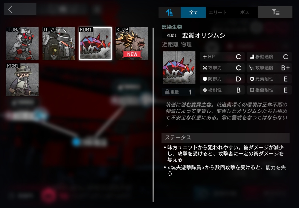 坑道の奥深くに巣食う変異野獣。ブロックされていない時、一部の中立ユニットにのみ遠距離攻撃できる。半径0.9以内に坑夫遊撃隊員が入ると、自身とその坑夫をバインドして交戦状態に入る。出現時、坑夫遊撃隊員からの攻撃のみを防ぐ最大HP5%分のバリアを持つ。バリア所持中は味方から狙われやすく、坑夫遊撃隊員以外からの物理・術の被ダメージを-50%し、攻撃速度+100、睡眠・恐怖無効。今回初登場。