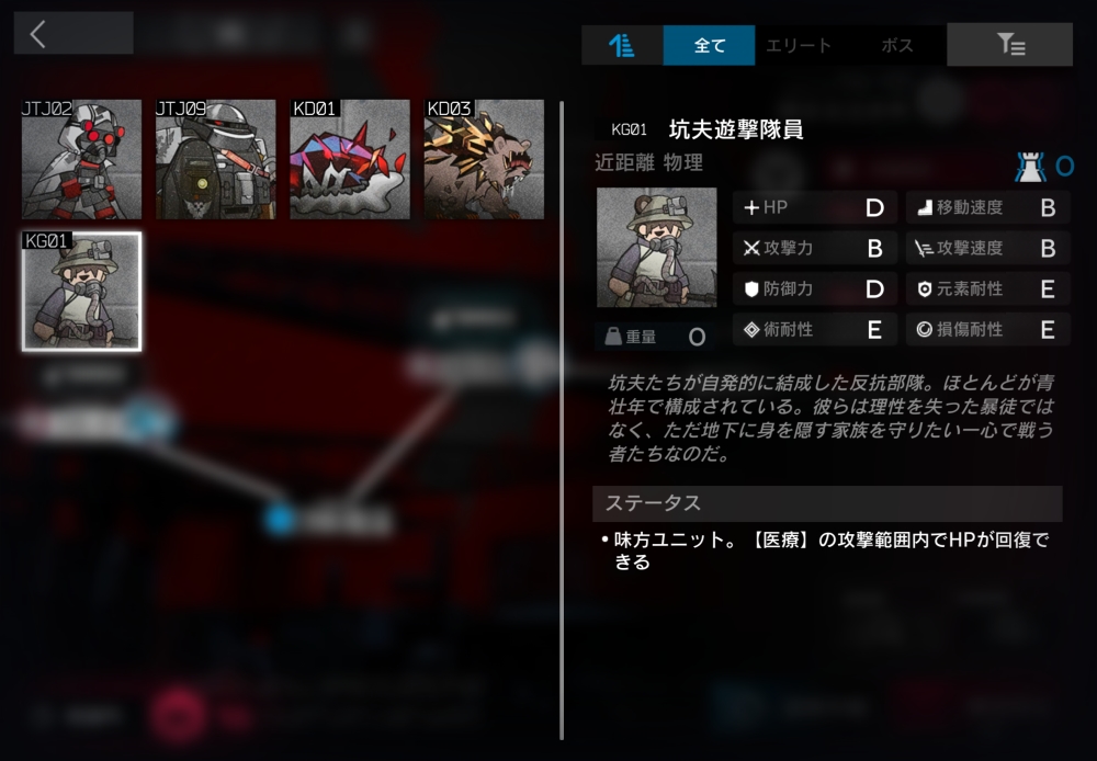 坑夫たちが自発的に結成した反抗部隊。中立ユニット。味方の対象にならず、敵から攻撃される。0.3秒ごとに、自身と周囲8マスの高リスク汚染を3秒間無効にする。医療オペレーターの攻撃範囲内にいる時、そのオペレーターの攻撃力の50%分のHPを毎秒回復する。医療が複数いる場合は個別に計算される。