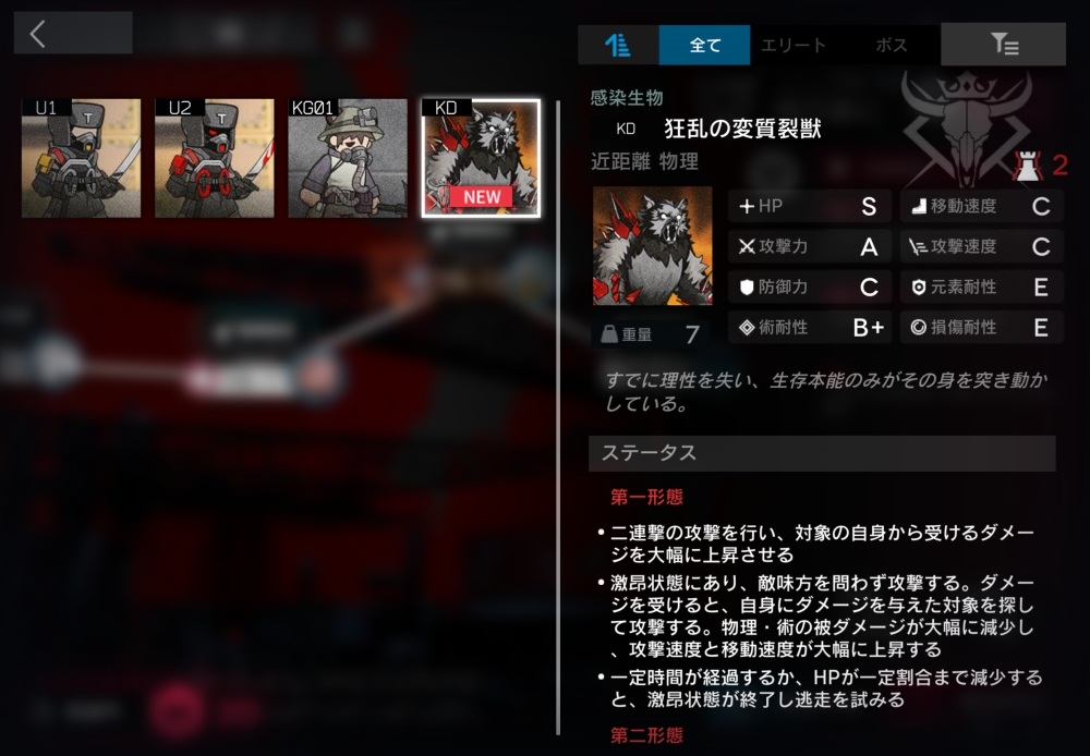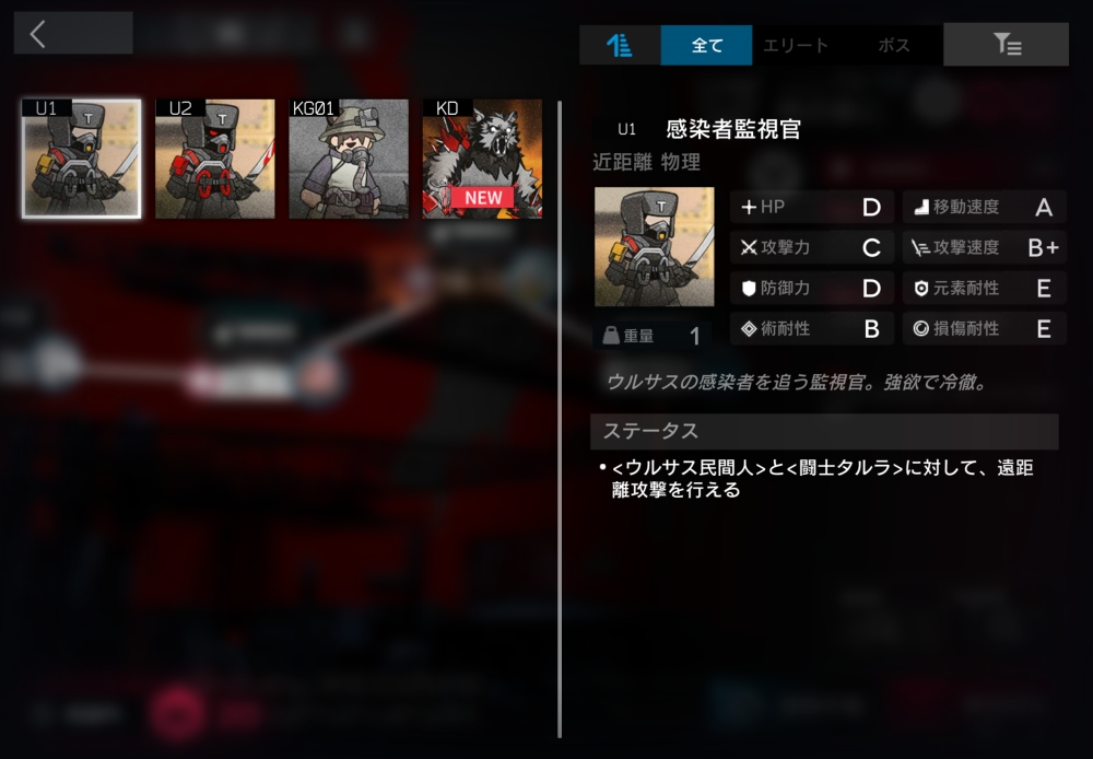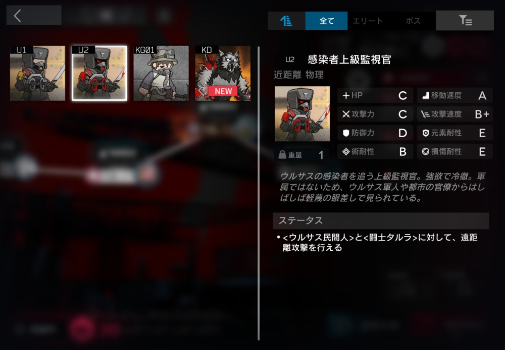 ウルサスの感染者許さないマンの偉い人。ウルサス民間人に対して遠距離攻撃してくる。1体だけ襲いかかってくる。