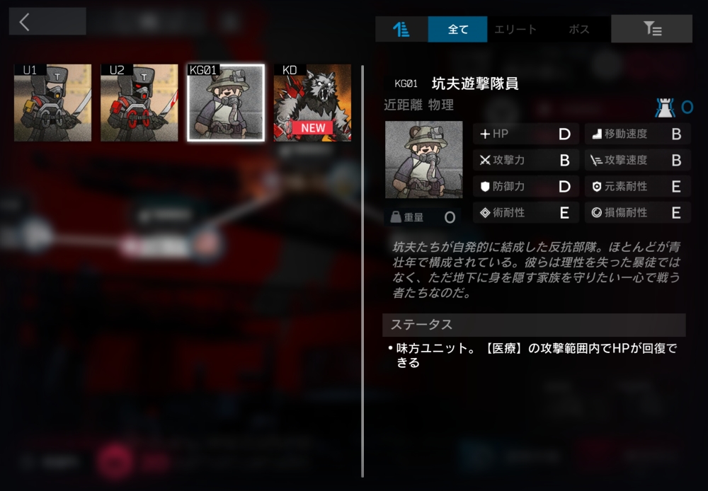 坑夫たちが自発的に結成した反抗部隊。中立ユニット。味方の対象にならず、敵から攻撃される。0.3秒ごとに、自身と周囲8マスの高リスク汚染を3秒間無効にする。医療オペレーターの攻撃範囲内にいる時、そのオペレーターの攻撃力の50%分のHPを毎秒回復する。医療が複数いる場合は個別に計算される。