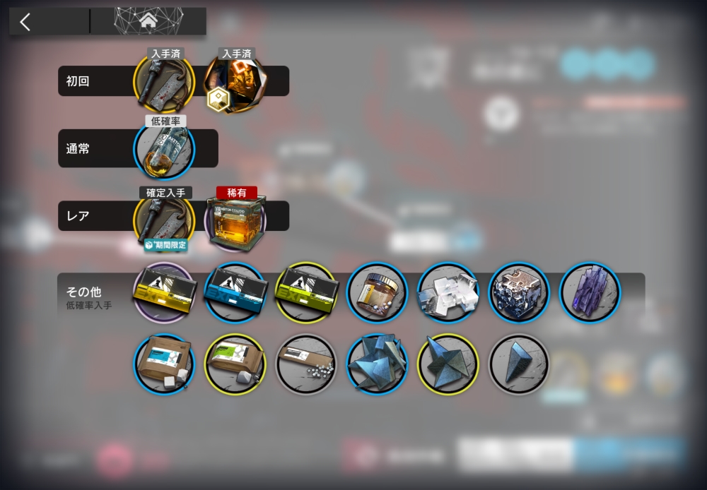 中級作戦記録、初級作戦記録、入門作戦記録、凝固核、転化塩、熾合金、マンガン、中級糖原、初級糖原、ブドウ糖、中級異鉄、初級異鉄、異鉄の欠片