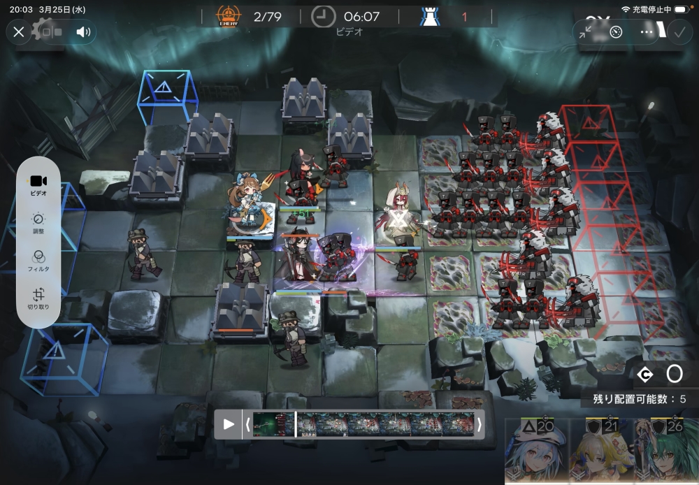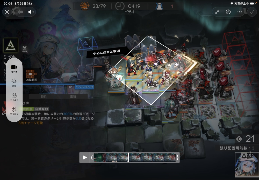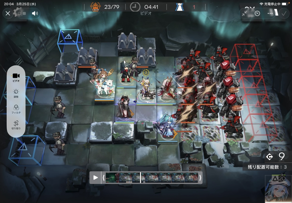 続いて、配置できるようになったら、周囲を同時に回復させたいので、医療の純燼エイヤフィヤトラちゃんをIN。スキルゲージを溜めていきます。
