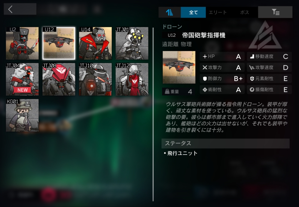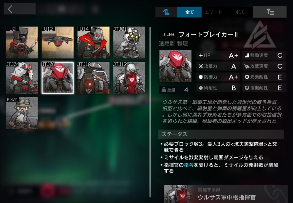 ウルサス第一軍事工場が開発した次世代の戦争兵器。必要ブロック数3。半径0.9以内に坑夫遊撃隊員が入ると、自身とその坑夫をバインドして交戦状態に入る。【爆撃】(自動回復/初期SP5/必要SP10)半径1.0以内の対象にミサイルを3発発射。各ミサイルは異なる対象を優先して狙い、対象と半径1.1以内の味方に攻撃力70%(700)の物理ダメージを与えてくる。マップ上にウルサス軍前線指揮兵系がいると、ミサイルの発射数が6発に増加。3体ほど襲いかかってくる。