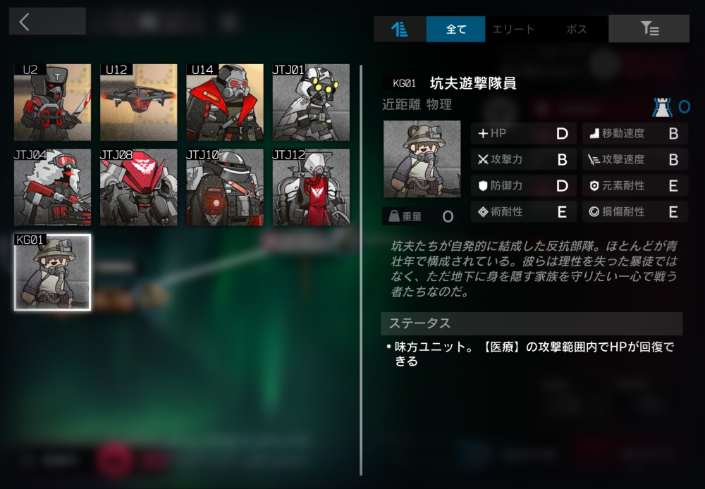 ウルサス軍の潜行部隊の一員。ブロック不可。一部の中立ユニットにのみ通常攻撃できる。半径0.9以内に坑夫遊撃隊員が入ると、自身とその坑夫をバインドして交戦状態に入る。8体ほどすり抜けようとしてくる。