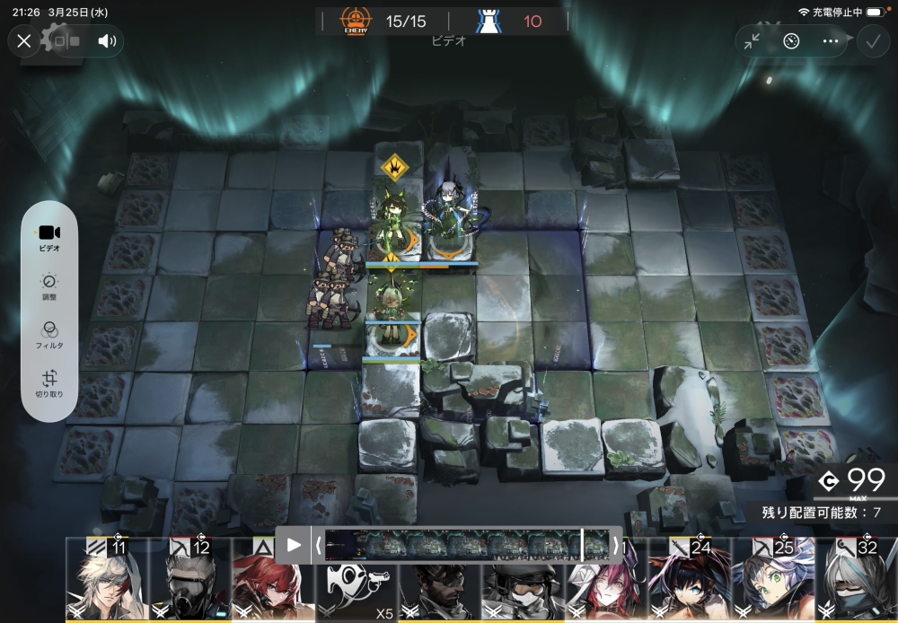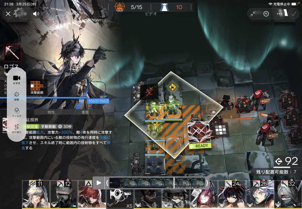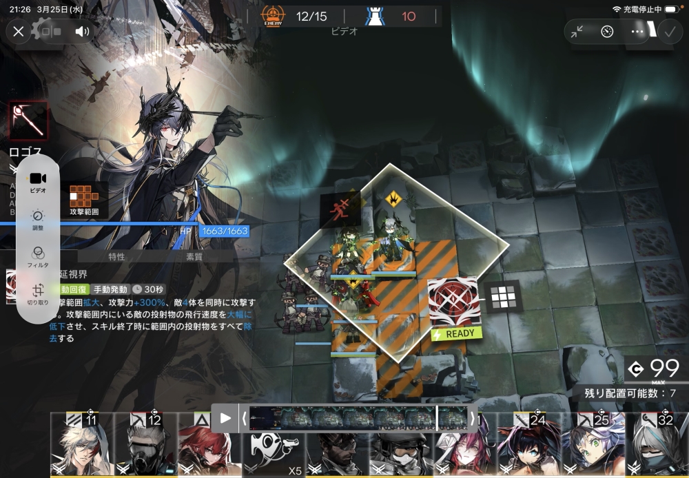 まずは、配置可能になったら、術師のロゴス大先生を投入。スキルゲージを溜めていきます。
