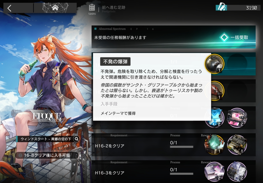 また、このステージをクリアすることで、ミッション「前へ進む足跡」で隠しアイテム「不発の爆弾」を獲得。16-19クリア後に、隠しストーリーである「EG-9」が解放されます。