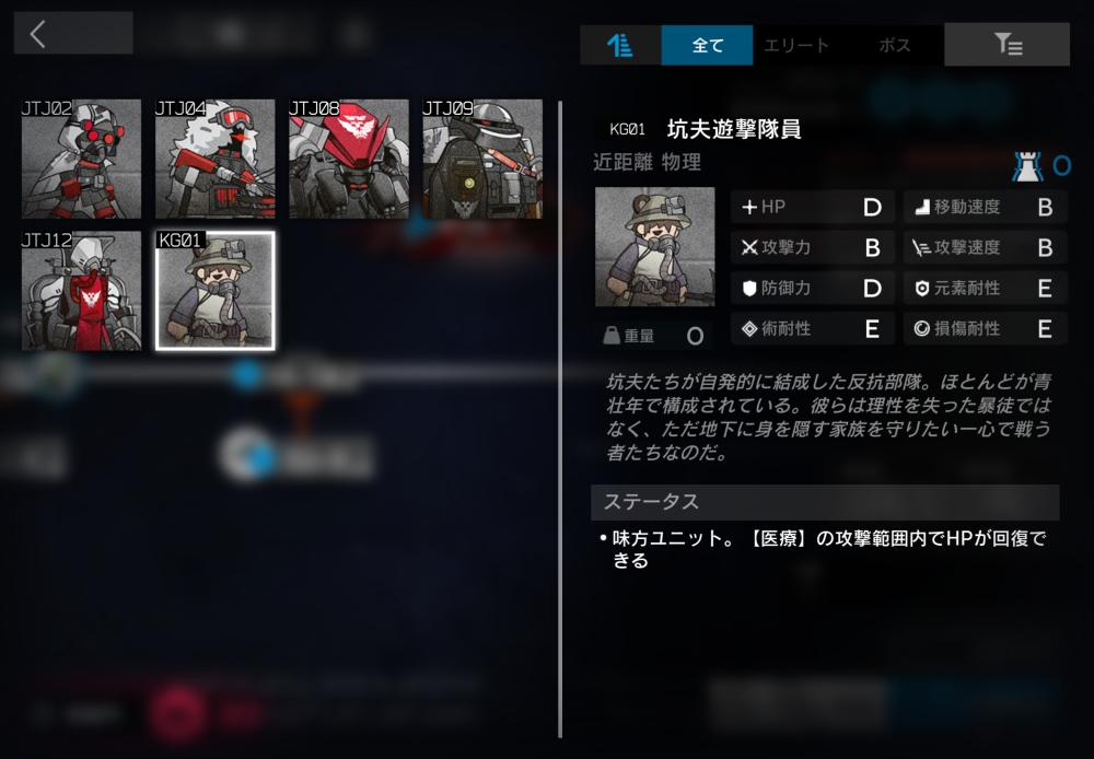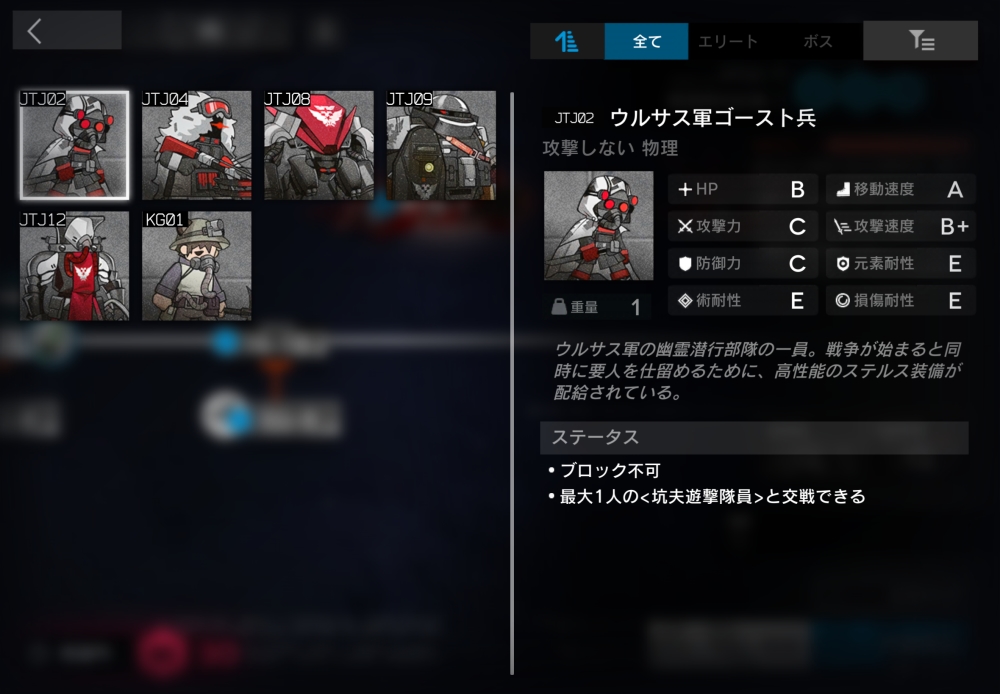 ウルサス軍の幽霊潜行部隊の一員。一部の中立ユニットにのみ通常攻撃できる。ブロック不可。半径0.9以内に坑夫遊撃隊員が入ると、自身とその坑夫をバインドして交戦状態に入る。17体ほどすり抜けようとしてくる。