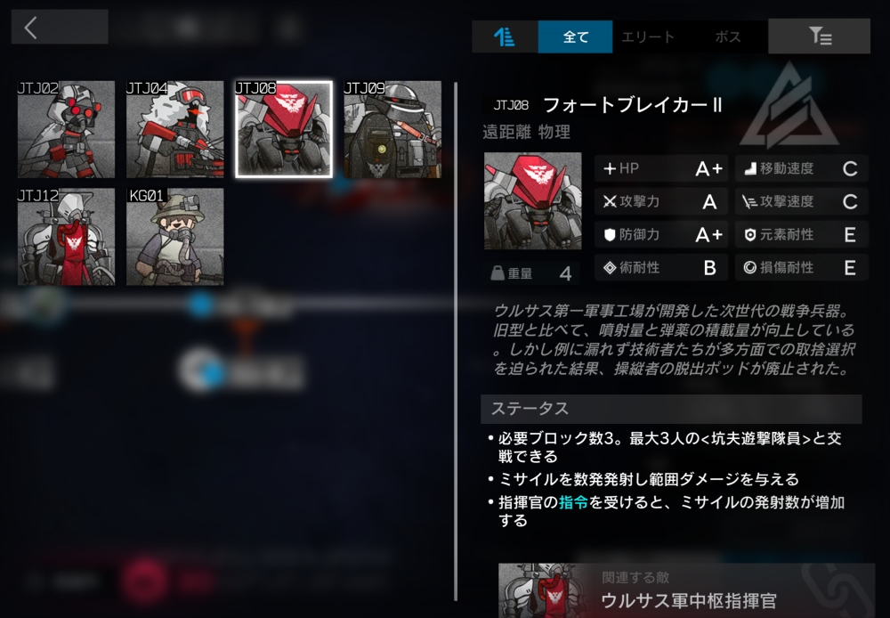 ウルサス第一軍事工場が開発した次世代の戦争兵器。必要ブロック数3。半径0.9以内に坑夫遊撃隊員が入ると、自身とその坑夫をバインドして交戦状態に入る。【爆撃】(自動回復/初期SP5/必要SP10)半径1.0以内の対象にミサイルを3発発射。各ミサイルは異なる対象を優先して狙い、対象と半径1.1以内の味方に攻撃力70%(700)の物理ダメージを与えてくる。マップ上にウルサス軍前線指揮兵系がいると、ミサイルの発射数が6発に増加。4体ほど襲いかかってくる。