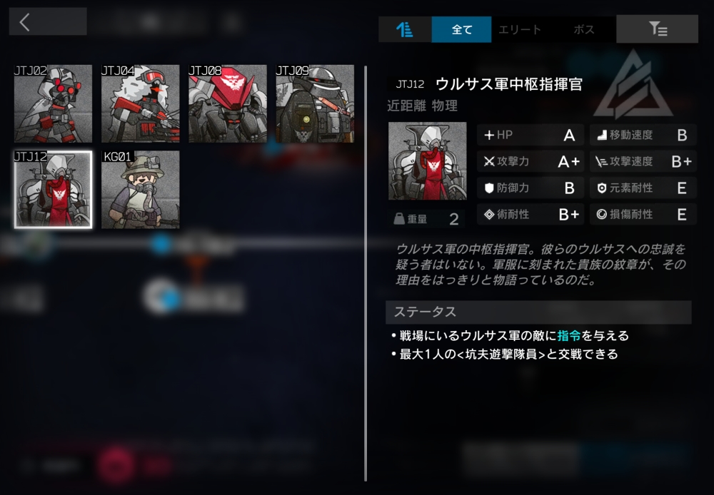 ウルサス軍の中枢指揮官。ブロックされていない時、一部の中立ユニットにのみ遠距離攻撃できる。半径0.9以内に坑夫遊撃隊員が入ると、自身とその坑夫をバインドして交戦状態に入る。マップ上にいる間、一部の敵が強化される。3体ほど襲いかかってくる。