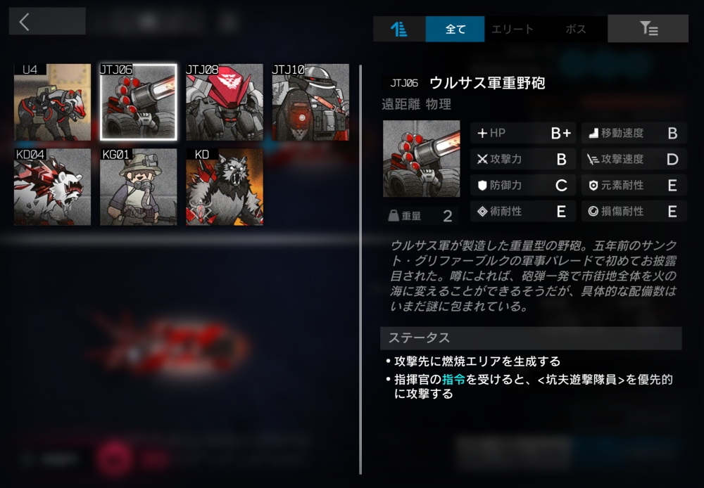 ウルサス軍が製造した重量型の野砲。遠距離物理攻撃をしてくる。通常攻撃は、爆発半径1.0の範囲物理攻撃。対象に攻撃が命中すると、その地点に半径1.5・持続3秒の燃焼エリアを発生させる。燃焼エリア内の味方は、毎秒150の術ダメージを受ける(複数あると重複する)。マップ上にウルサス軍前線指揮兵系がいる時、坑夫遊撃隊員を優先して狙う。3台ほど撃ち込んでくる。