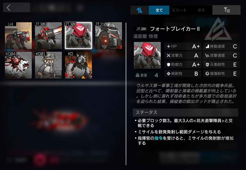 ウルサス第一軍事工場が開発した次世代の戦争兵器。必要ブロック数3。半径0.9以内に坑夫遊撃隊員が入ると、自身とその坑夫をバインドして交戦状態に入る。【爆撃】(自動回復/初期SP5/必要SP10)半径1.0以内の対象にミサイルを3発発射。各ミサイルは異なる対象を優先して狙い、対象と半径1.1以内の味方に攻撃力70%(700)の物理ダメージを与えてくる。マップ上にウルサス軍前線指揮兵系がいると、ミサイルの発射数が6発に増加。4体ほど襲いかかってくる。
