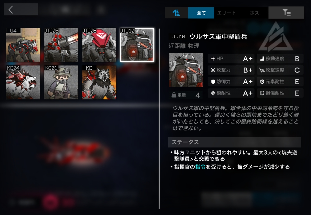 ウルサス軍の中堅盾兵。ブロックされていない時、一部の中立ユニットにのみ遠距離攻撃できる。半径0.9以内に坑夫遊撃隊員が入ると、自身とその坑夫をバインドして交戦状態に入る。味方から狙われやすい。マップ上にウルサス軍前線指揮兵系がいると、物理・術の被ダメージ-40%。4体ほど襲いかかってくる。