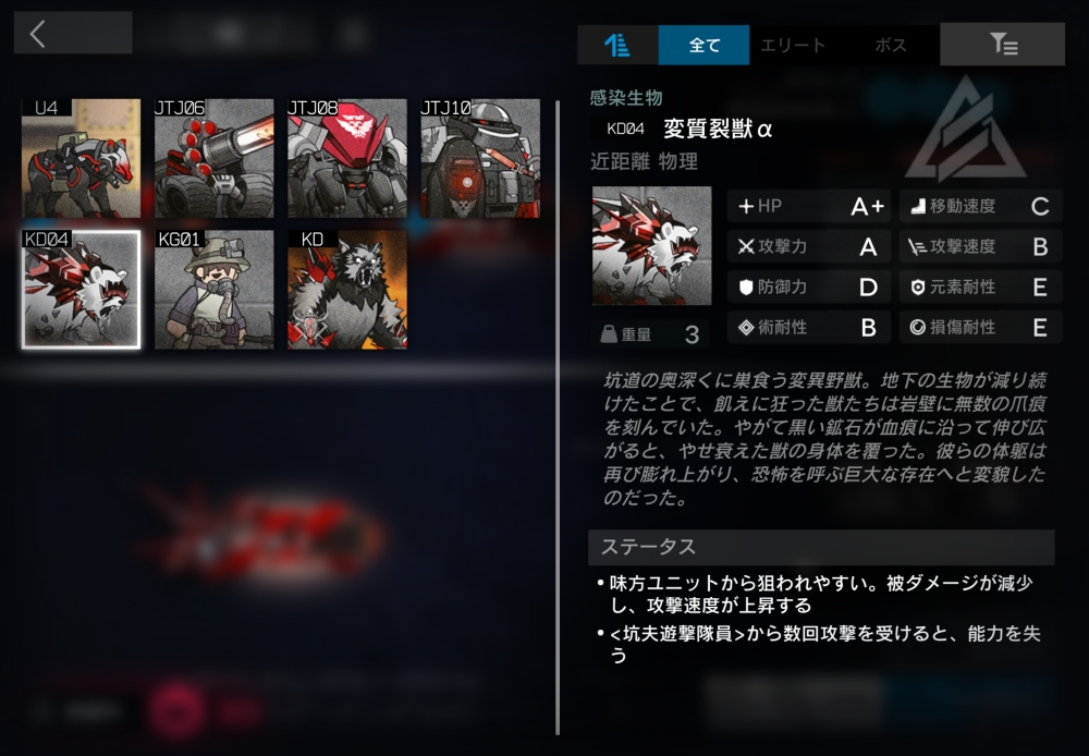坑道の奥深くに巣食う変異野獣。ブロックされていない時、一部の中立ユニットにのみ遠距離攻撃できる。半径0.9以内に坑夫遊撃隊員が入ると、自身とその坑夫をバインドして交戦状態に入る。出現時、坑夫遊撃隊員からの攻撃のみを防ぐ最大HP5%分のバリアを持つ。バリア所持中は味方から狙われやすく、坑夫遊撃隊員以外からの物理・術の被ダメージを-50%し、攻撃速度+100、睡眠・恐怖無効。5体ほど襲いかかってくる。