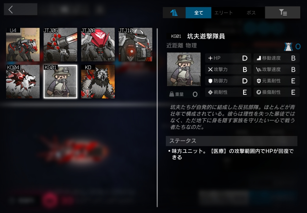 坑夫たちが自発的に結成した反抗部隊。中立ユニット。味方の対象にならず、敵から攻撃される。0.3秒ごとに、自身と周囲8マスの高リスク汚染を3秒間無効にする。医療オペレーターの攻撃範囲内にいる時、そのオペレーターの攻撃力の50%分のHPを毎秒回復する。医療が複数いる場合は個別に計算される。