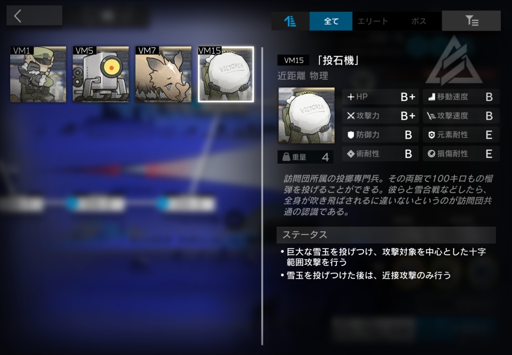 訪問団所属の投擲専門兵。その両腕で100キロものbbb榴弾を投げることができる。初回攻撃時、対象と周囲4マスの味方に攻撃力150%の術ダメージ(1200)を与えてくる。その後は近距離物理攻撃のみを行うようになる。7体ほど投げつけてくる。
