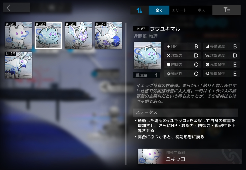 イェラグ特有の在来種。通過した<ユキッコ>を吸収してパワーアップする。ただし、高台にぶつかると、初期状態に戻る。2体ほど襲いかかってくる。