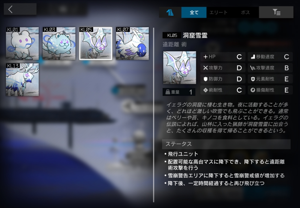 イェラグの洞窟に棲む生き物。遠距離術攻撃をしてくる。通常状態では攻撃しない。自身のいるマスが「何も配置されていない配置可能な高台で、そのマスにいる降下状態の洞窟雪霊系の敵が3体未満」なら、【降下】を使用する。【降下】(自動回復/初期SP60/必要SP60)降下状態に移行。モーション中はスタン・睡眠・凍結・浮遊無効。移行後、降下した警告エリアの雪崩警戒値+1。降下状態では移動せず、ブロック不可・強制移動無効。なお、この能力は無効化できる。降下状態に移行してから30秒経過する・同じマスにオペレーターが配置される・雪崩の影響を受ける、このいずれかの場合に離陸し、通常状態に戻る。12体ほど襲いかかってくる。