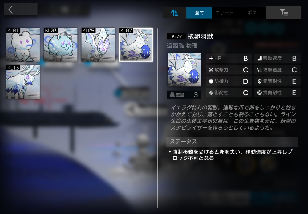 イェラグ特有の羽獣。遠距離物理攻撃をしてくる。通常状態では攻撃しない。自身のいるマスが「何も配置されていない配置可能な高台で、そのマスにいる降下状態の洞窟雪霊系の敵が3体未満」なら、【降下】を使用する。【降下】(自動回復/初期SP60/必要SP60)降下状態に移行。モーション中はスタン・睡眠・凍結・浮遊無効。移行後、降下した警告エリアの雪崩警戒値+1。降下状態では移動せず、ブロック不可・強制移動無効。なお、この能力は無効化できる。降下状態に移行してから30秒経過する・同じマスにオペレーターが配置される・雪崩の影響を受ける、このいずれかの場合に離陸し、通常状態に戻る。強制移動を受けると卵を失い、移動速度が上昇し、ブロック不可になる。15体ほど襲いかかってくる。