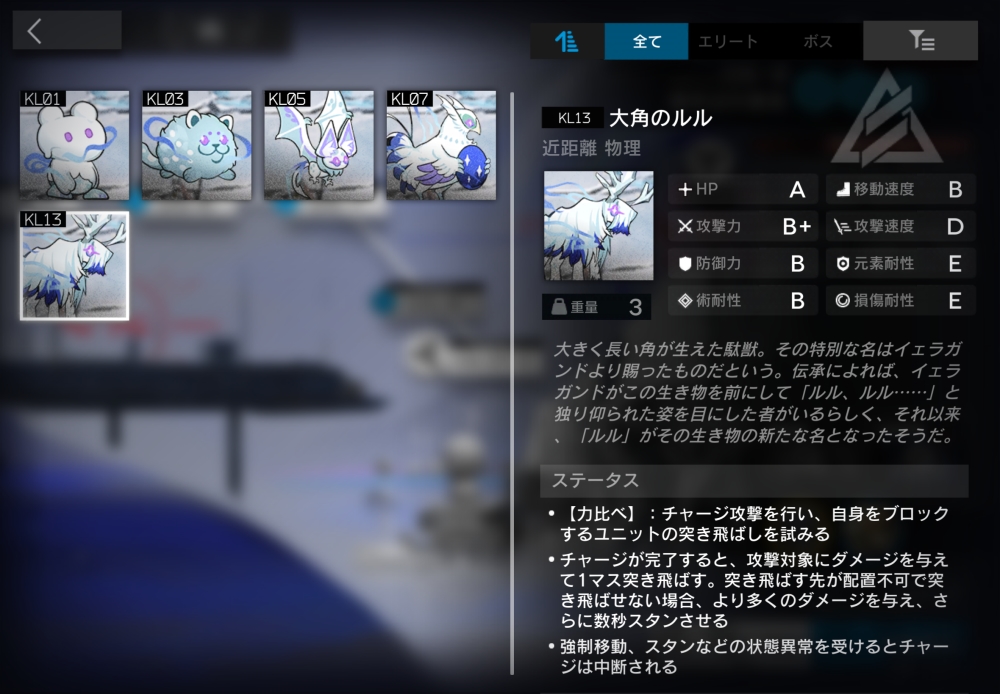 大きく長い角が生えた駄獣。【力比べ】(自動回復/初期SP20/必要SP20)ブロック中に使用可能。6.6秒チャージした後、味方に攻撃力100%(800)の物理ダメージを与え、雪崩の効果を与えてくる。雪崩:オペレーターには1マスの強制移動+750の確定ダメージを、移動できない位置のオペレーターや召喚ユニットには5000の確定ダメージ+10秒のスタンを与えてくる。雪崩が発生しないステージでは、雪崩の効果は発生しない。なお、この能力は無効化できる。【力比べ】でダメージを与えられなかった時、5秒間通常攻撃しない。また、【力比べ】終了時にスタン・睡眠していた場合は4秒間通常攻撃しない。1体だけ襲いかかってくる。