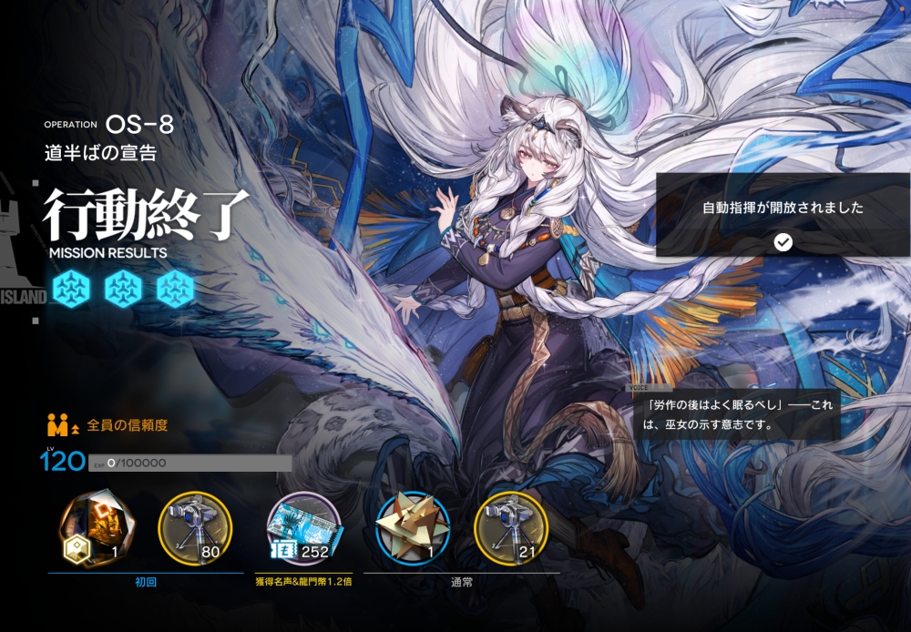 あとは、このまま敵を倒して作戦終了。無事、アークナイツ OS-8 攻略完了です。お疲れさまでした。