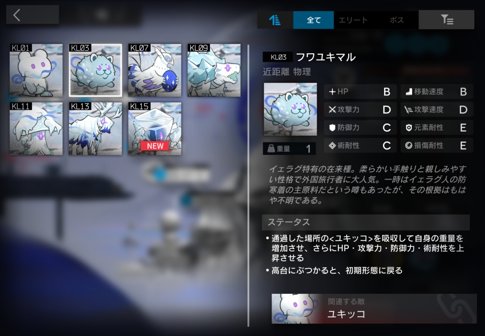 イェラグ特有の在来種。通過した<ユキッコ>を吸収してパワーアップする。ただし、高台にぶつかると、初期状態に戻る。5体ほど襲いかかってくる。