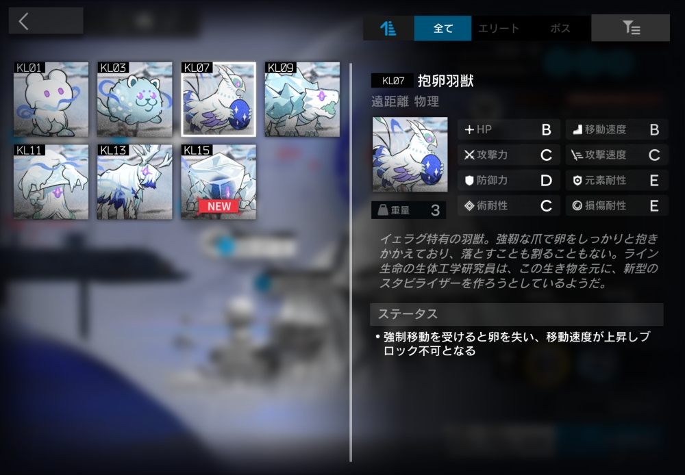 イェラグ特有の羽獣。遠距離物理攻撃をしてくる。通常状態では攻撃しない。自身のいるマスが「何も配置されていない配置可能な高台で、そのマスにいる降下状態の洞窟雪霊系の敵が3体未満」なら、【降下】を使用する。【降下】(自動回復/初期SP60/必要SP60)降下状態に移行。モーション中はスタン・睡眠・凍結・浮遊無効。移行後、降下した警告エリアの雪崩警戒値+1。降下状態では移動せず、ブロック不可・強制移動無効。なお、この能力は無効化できる。降下状態に移行してから30秒経過する・同じマスにオペレーターが配置される・雪崩の影響を受ける、このいずれかの場合に離陸し、通常状態に戻る。強制移動を受けると卵を失い、移動速度が上昇し、ブロック不可になる。9体ほど襲いかかってくる。