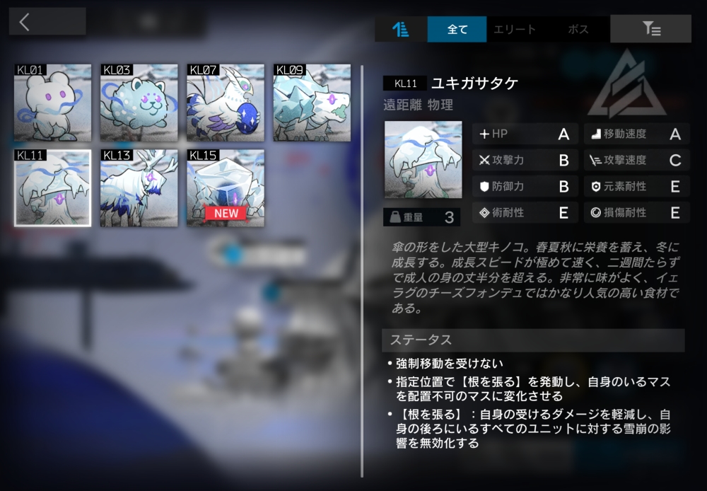 傘の形をした大型キノコ。遠距離物理攻撃をしてくる。強制移動・転移無効。通常状態では近距離物理攻撃を行う。【根を張る】特定のマスに入ると使用。自身のマスを配置不可にし、自身の背後の行/列は雪崩の影響を受けなくなる。この間は移動せずブロック不可、浮遊無効。遠距離術攻撃を行い、物理・術の被ダメージ-50%。一定時間経つと通常状態に戻る。3体ほど襲いかかってくる。