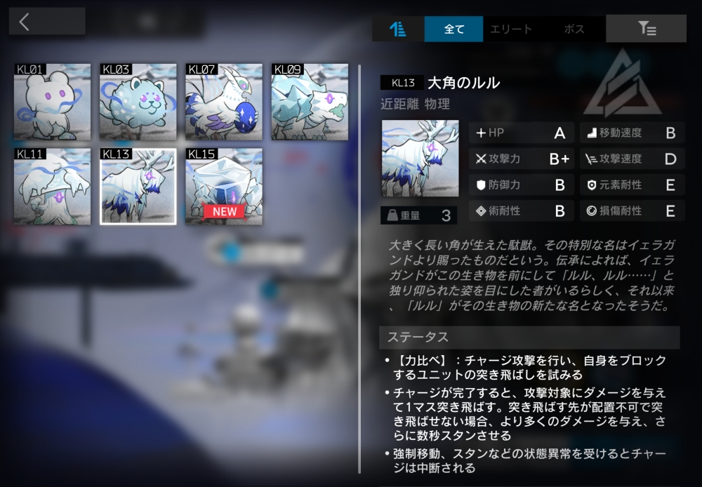大きく長い角が生えた駄獣。【力比べ】(自動回復/初期SP20/必要SP20)ブロック中に使用可能。6.6秒チャージした後、味方に攻撃力100%(800)の物理ダメージを与え、雪崩の効果を与えてくる。雪崩:オペレーターには1マスの強制移動+750の確定ダメージを、移動できない位置のオペレーターや召喚ユニットには5000の確定ダメージ+10秒のスタンを与えてくる。雪崩が発生しないステージでは、雪崩の効果は発生しない。なお、この能力は無効化できる。【力比べ】でダメージを与えられなかった時、5秒間通常攻撃しない。また、【力比べ】終了時にスタン・睡眠していた場合は4秒間通常攻撃しない。2体ほど襲いかかってくる。