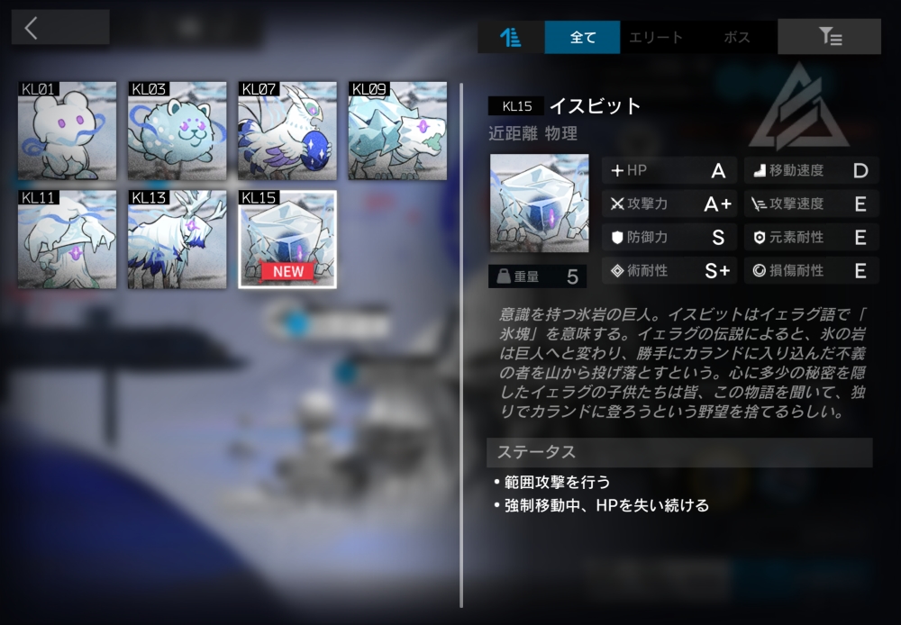 意識を持つ氷岩の巨人。氷の高台として出現。雪崩の影響を受けると敵に変化する。この時、配置されていた味方は強制撤退する。近距離攻撃のみ行う。通常攻撃後、対象の半径1.5以内(周囲8マス)の味方にも攻撃力100%(1500)の物理ダメージを与えてくる。強制移動中、0.066秒ごとに800(1秒で約12000)の確定ダメージを受ける。今回初登場。