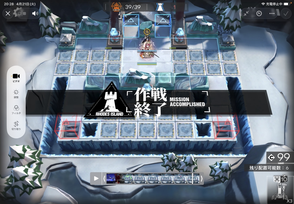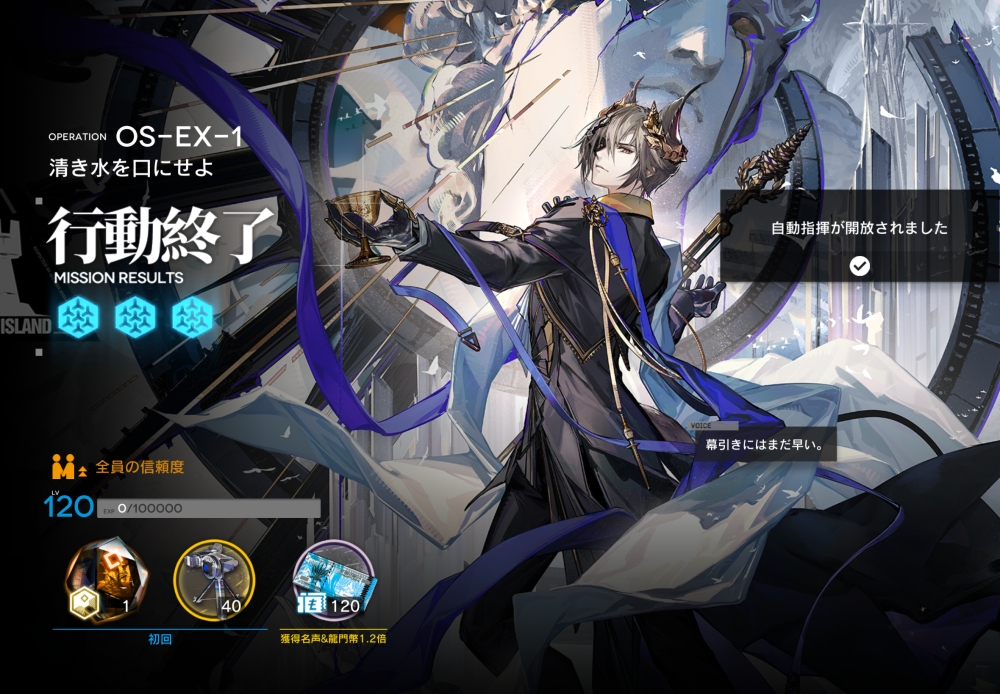 あとは、このまま敵を倒して作戦終了。無事、アークナイツ OS-EX-1 攻略完了です。お疲れさまでした。