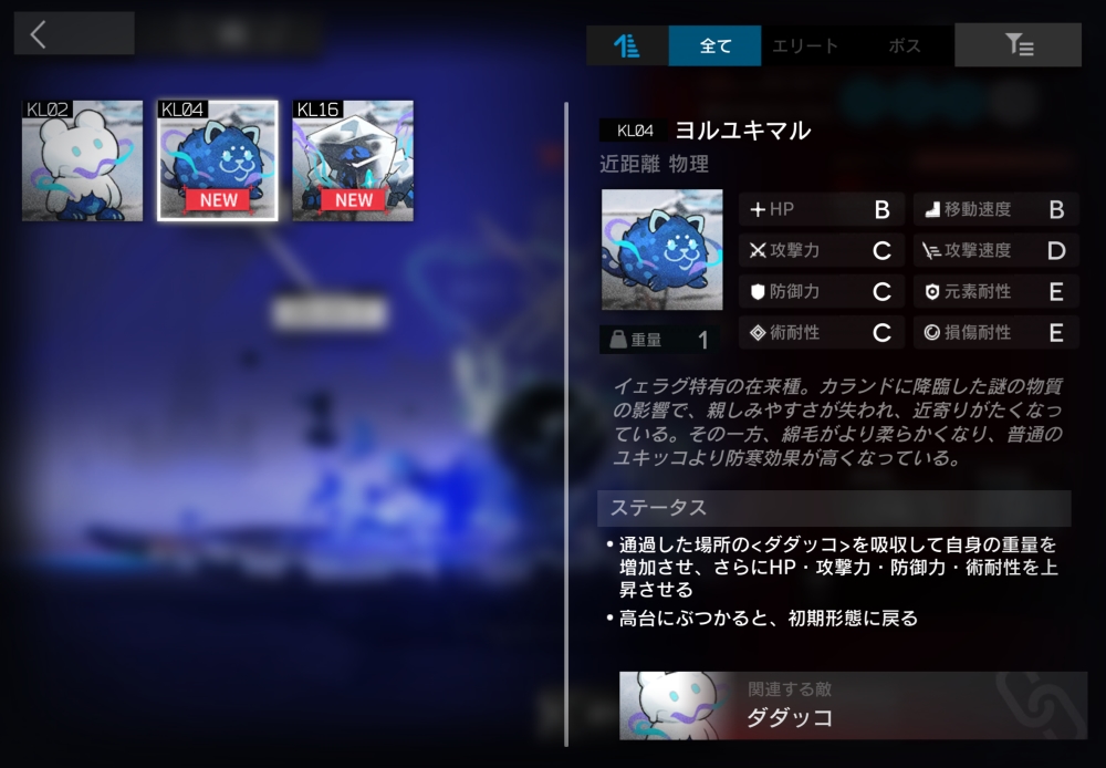 イェラグ特有の在来種。半径0.5以内に入ったユキッコ系の敵を吸収する。1体吸収するごとにHP+7000、攻撃力+300、防御力+200、術耐性+10、重量+1。このバフは3層まで累積し、3層になると吸収しなくなる。強制移動で高台・マップ外周に衝突すると、上記のバフはすべて解除される。今回初登場。
