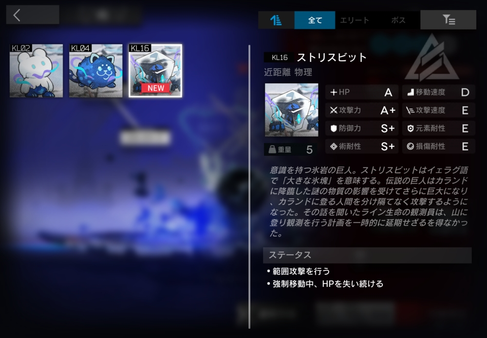 意識を持つ氷岩の巨人。ストリスビットはイェラグ語で「大きな氷塊」を意味する。氷の高台として出現。雪崩の影響を受けると敵に変化する。この時、配置されていた味方は強制撤退する。近距離攻撃のみ行う。通常攻撃後、対象の半径1.5以内(周囲8マス)の味方にも攻撃力100%(1500)の物理ダメージを与えてくる。強制移動中、0.066秒ごとに800(1秒で約12000)の確定ダメージを受ける。今回初登場。