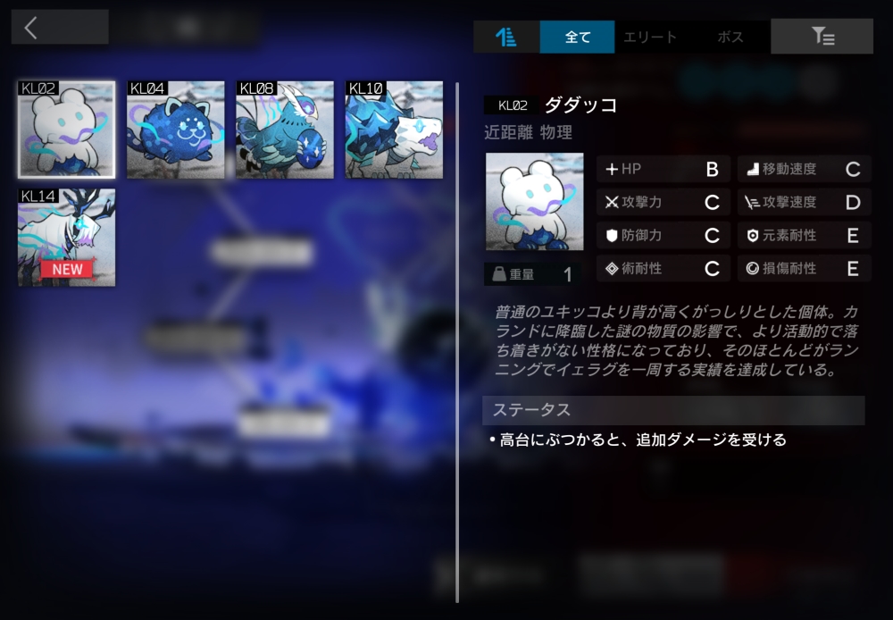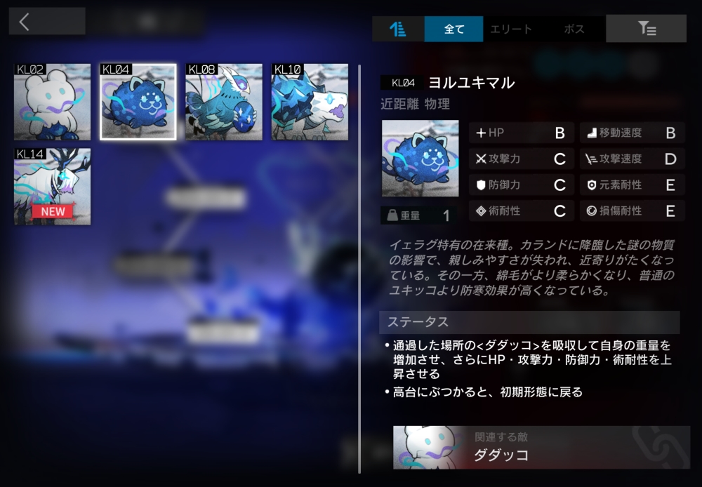 イェラグ特有の在来種。半径0.5以内に入ったユキッコ系の敵を吸収する。1体吸収するごとにHP+7000、攻撃力+300、防御力+200、術耐性+10、重量+1。このバフは3層まで累積し、3層になると吸収しなくなる。強制移動で高台・マップ外周に衝突すると、上記のバフはすべて解除される。3体ほど襲いかかってくる。