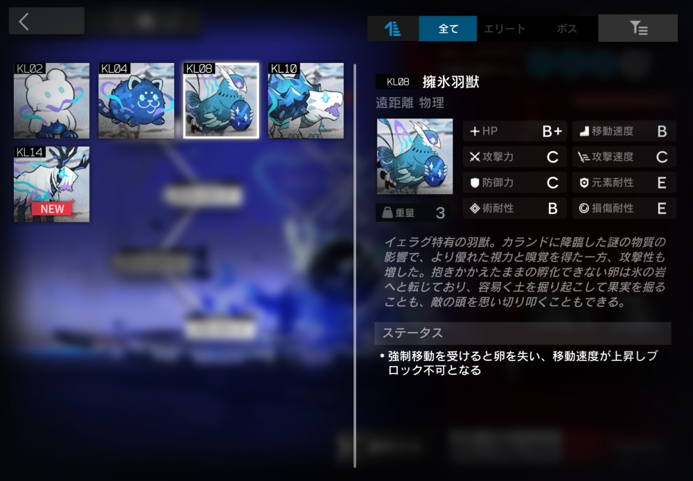イェラグ特有の羽獣。遠距離物理攻撃をしてくる。カランドに降臨した謎の物質の影響で、より優れた視力と嗅覚を得た一方、攻撃性も増した。強制移動を受けると卵を失う。以降は通常攻撃せず、ブロック不可・移動速度×2.0。14体ほど襲いかかってくる。
