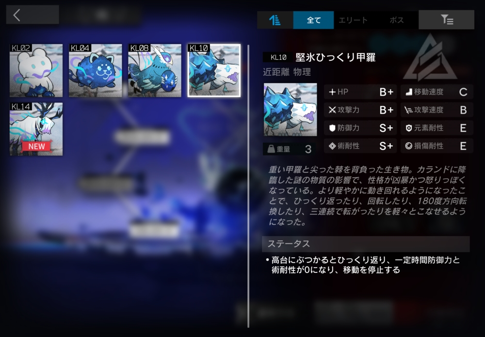 重い甲羅と尖った棘を背負った生き物。カランドに降臨した謎の物質の影響で、性格が凶暴かつ怒りっぽくなっている。強制移動で高台・マップ外周に衝突すると30秒間ひっくり返り、防御力・術耐性が0になる。この間、移動せずブロック不可。12体ほど襲いかかってくる。