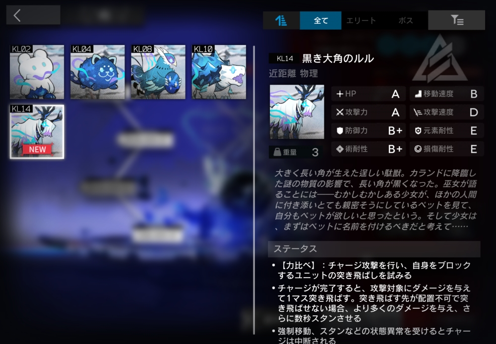 大きく長い角が生えた逞しい駄獣。カランドに降臨した謎の物質の影響で、長い角が黒くなった。【力比べ】(自動回復/初期SP20/必要SP20)ブロック中に使用可能。6.6秒チャージした後、味方に攻撃力100%(1000)の物理ダメージを与え、雪崩の効果を与えてくる。雪崩:オペレーターには1マスの強制移動+750の確定ダメージを、移動できない位置のオペレーターや召喚ユニットには5000の確定ダメージ+10秒のスタンを与える。雪崩が発生しないステージでは、雪崩の効果は発生しない。なお、この能力は無効化できる。【力比べ】でダメージを与えられなかった時、5秒間通常攻撃しない。また、【力比べ】終了時にスタン・睡眠していた場合は4秒間通常攻撃しない。今回初登場。